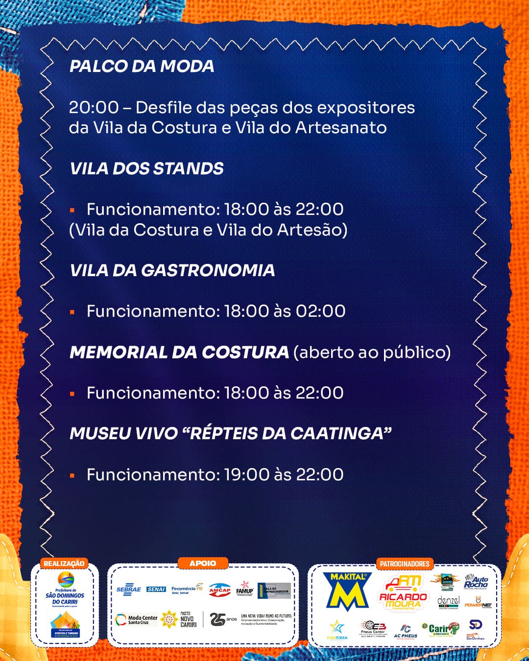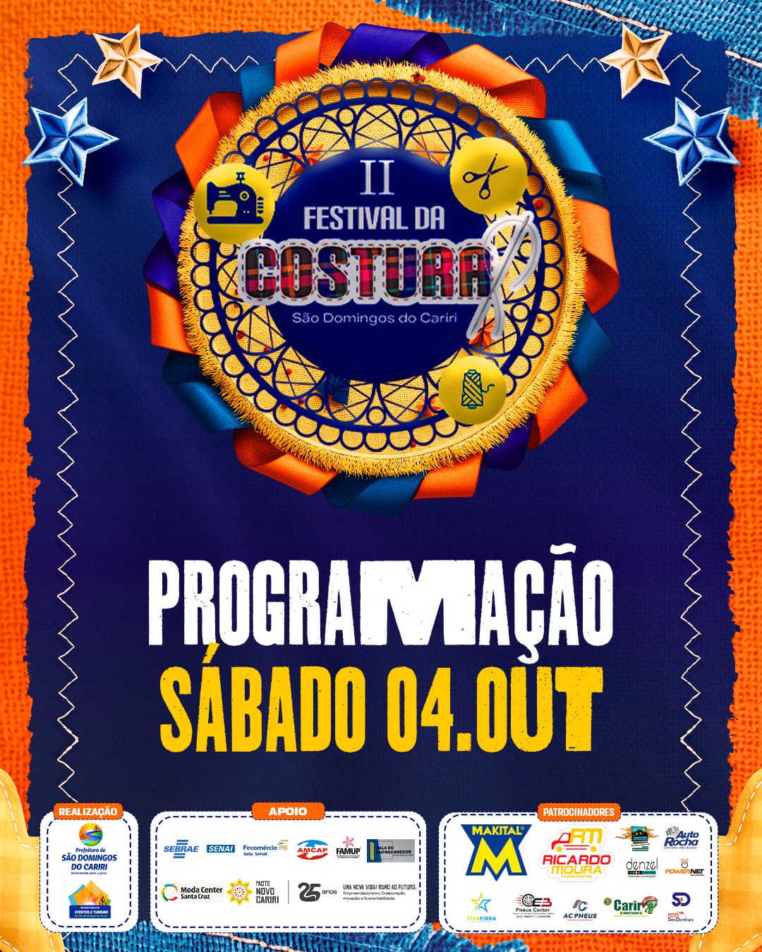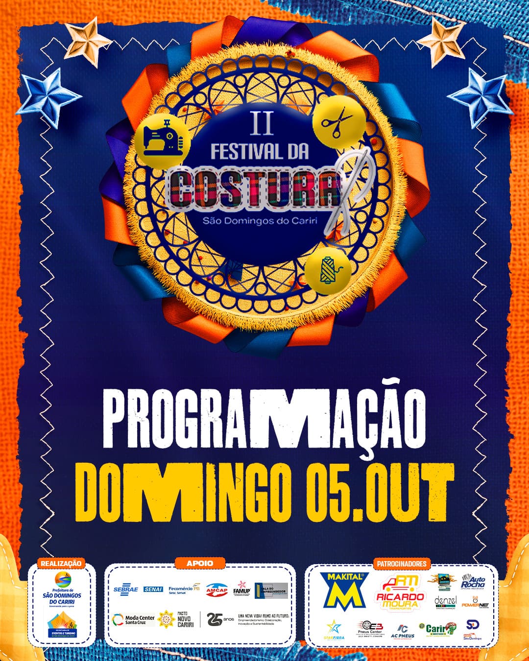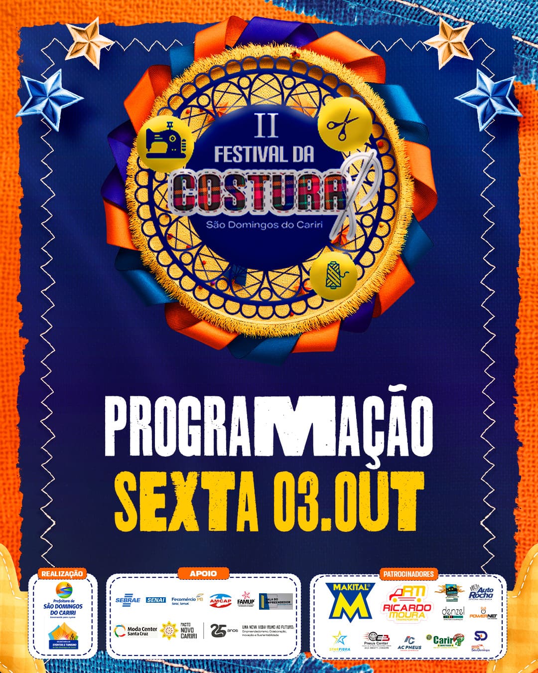 Trata-se de um evento pioneiro na região, durante 03 dias o FESTIVAL DA COSTURA permitirá o encontro e a sinergia da cadeia produtiva da indústria, comercio e serviços da confecção de São Domingos do Cariri e região. Empresários, profissionais da costura, técnicos estudiosos, governos, apreciadores e interessados, terão a oportunidade de expor, comercializar, promover intercâmbios, ampliar redes de negócios, além de participar de uma gama diversificada de ações como: exposição de produtos e serviços, atendimento personalizado, espaços interativos, orientação, tecnologia e inovação.